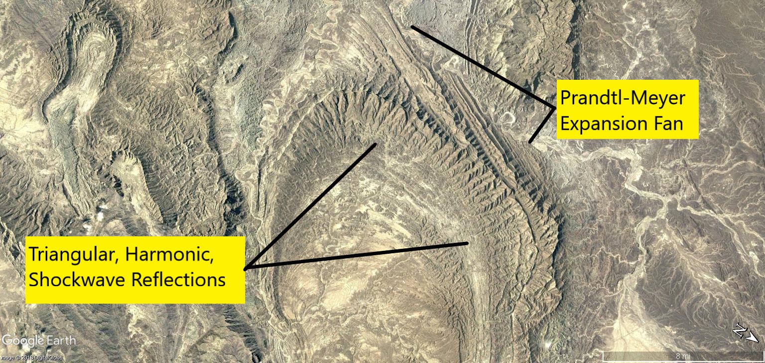 Figure 8. A profusion of harmonic shock structures in the Karakorum attest to sonic frequencies and unstable winds inside and surrounding a “V” notch. Note the smaller size and pattern of the harmonics inside the Mach Stem “V” notch. It is likely, IMO, the Lambda structure was unstable and vibrating violently to create these harmonics during mountain formation.