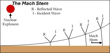 Then I discovered the “Mach Stem” – see the linked video. The Mach Stem is also depicted in the Figure 3 diagram of a shockwave from an airburst nuclear detonation. Because of the particular attitude of an airburst event, and the Mach angle the shockwave makes with respect to the ground, it forms a Mach Stem at the very tip of the Lambda structure triple point.