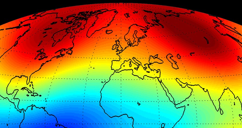 The mean magnetic north rests somewhere in the sea between the dark red shaded regions of high flux over arctic Siberia and Canada, and it’s rapidly tracking towards Siberia. But it now looks like there are two poles forming at both ends of the planet – four poles – the Southern hemisphere looks much the same. And the deep red blotch over Siberia is gaining strength.
