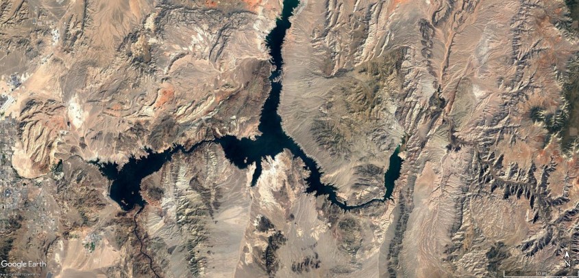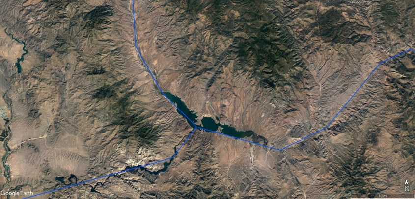The discharge adopted an “X” pattern where it made connection, with east-west branches vectored along the electric field denoted by the dotted red and green lines in Figure 3. The electric field is the dipolar alignment between the lakes. The lakes, or the depressions where these lakes are, were created in the same discharge event that met at the crux of the “X” and sent reactive discharges rotated at 90 degrees to the originating spark between the circuit domains. The discharge is much like the “resonant frequency discharges”, discussed in Chapter 8 and 9 of Eye of the Storm, which created the major 180 degree (or nearly so) branches of the Colorado (Figures 4).