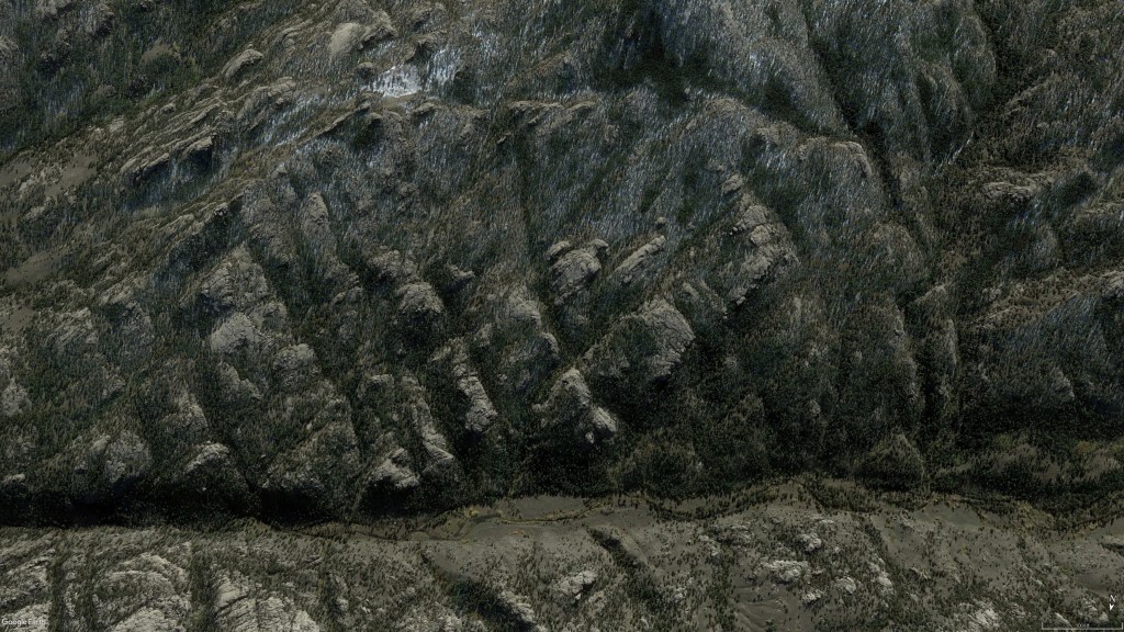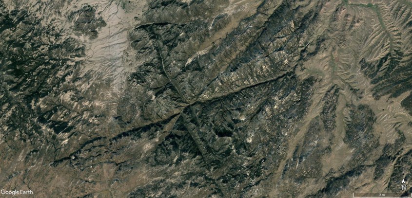 This whole mountain range is direct and unequivocal evidence of electric formation. Conventional means of uplift, faulting and erosion requiring several eons of disconnected events could not, by any reasonably statistical probability produce phase diagrams 15 miles across the face of the earth with induced current paths shaped by magnetic field lines.