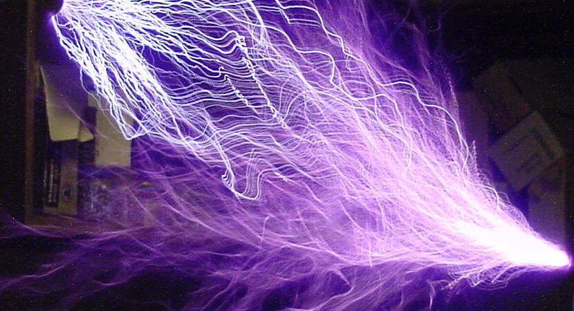 Figure 22. Tesla coil discharge (white filaments) makes connection with an electrode. Reactive power currents (violet flames) spread in a cone around the discharge.