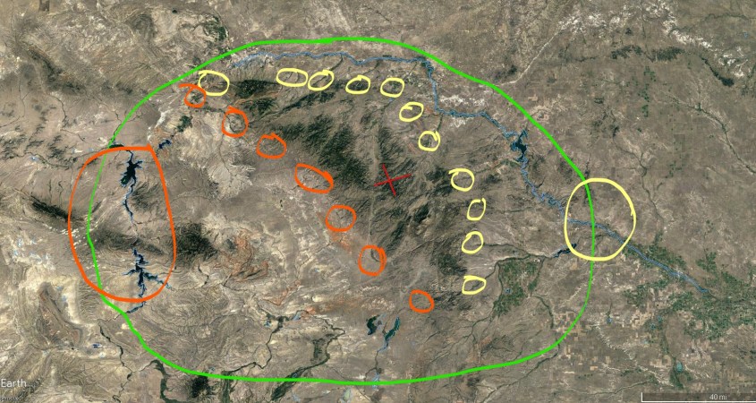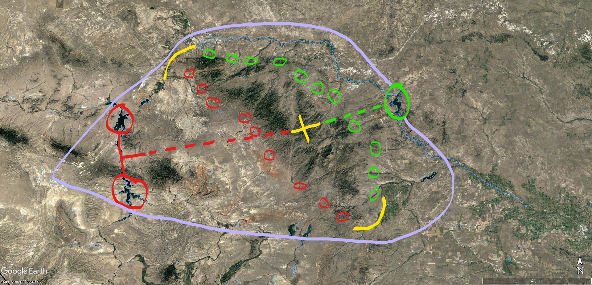 The annotated image in Figure 3 shows the area of interest, circled in violet, including the Laramie Mountains surrounded by green and red circles. The Laramie’s are part of the Continental Divide as it cuts through south-eastern Wyoming. The circles denote the major streams flowing from the mountains. Green are streams flowing to the North Platte, and thence to the Missouri and ultimately the Mississippi Valley and the Gulf of Mexico. Red are streams that flow to a sink in the basin west of the mountain range. The sink forms the Seminoe and Pathfinder Reservoirs, also circled in red west of the mountains, and the North Platte River forms the Glendo Reservoir on the opposite side, circled in green.