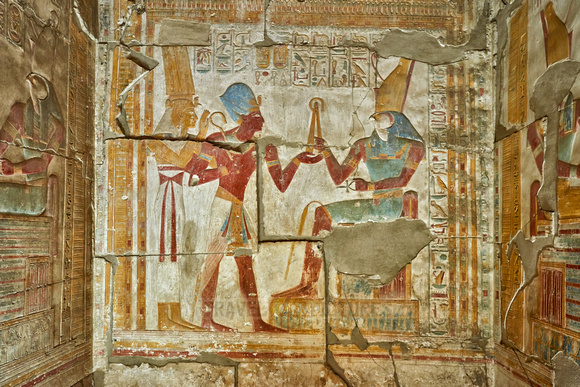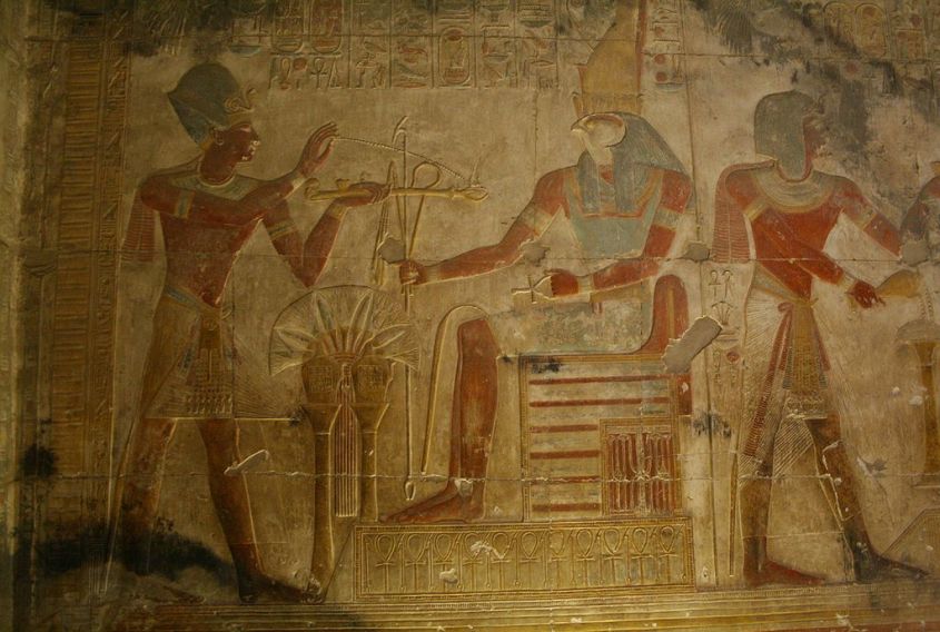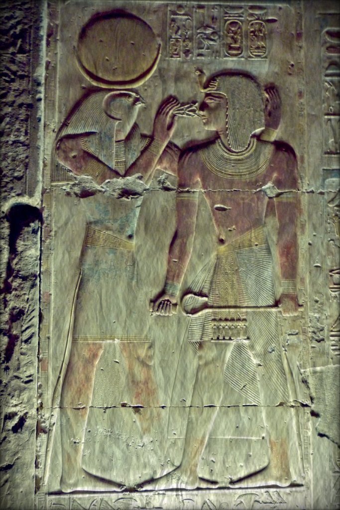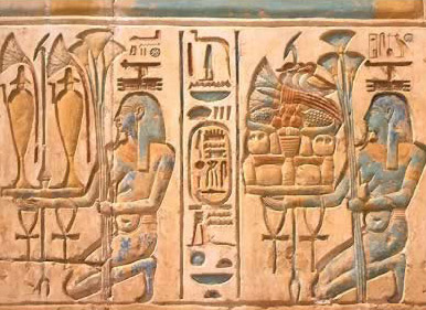 Notice the positioning of the tools in the next group of images. Notice how the flail is held brushing the shoulder. The crook is held to the neck. And the characters are in the act of touching each other using their hands, nose, staff and ankh. The Ankh is often depicted held a fraction of an inch from a character’s nose by the hand of another.