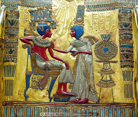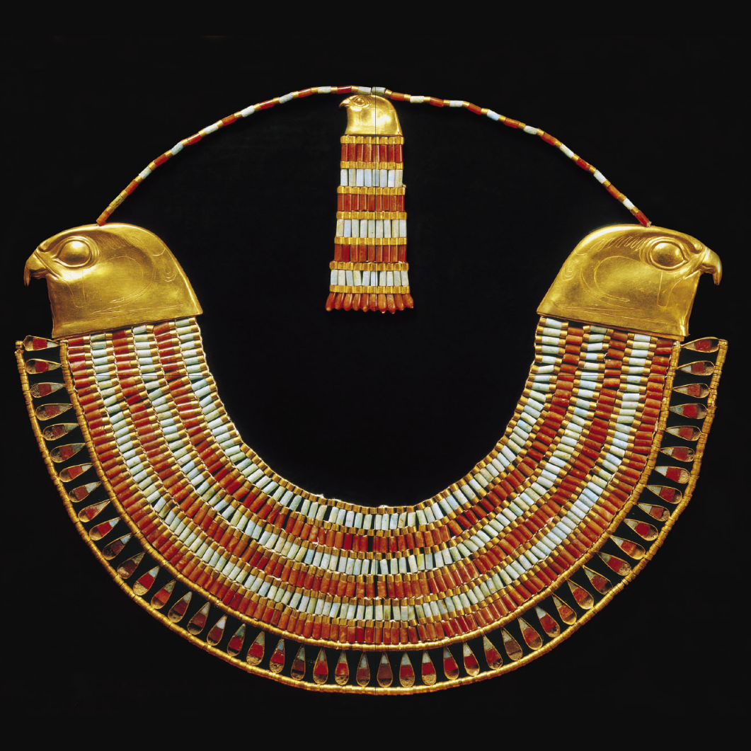 The common attire is the headgear and collar. The headgear varies widely, but common features are the protruding antennas, usually in the form of cobras at the forehead; and the shape, although variable, always forms an absurdly voluminous envelope about the head. The collar covers the chest, made of concentric rings of metals and beads of precious stones. Metals, especially gold, were used profusely, in both the attire and tools, as were minerals such as Lapis Lazuli.