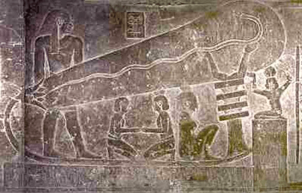 The entire scenario depicts a circuit, with the Djed delivering capacitor charge to what appears to be a giant lightbulb. It clearly shows halos of plasma discharge between the characters and the bulb – into their heads. The bulb is a giant plasma ball being charged by a big-ass capacitor. There is circuitry, frequency and discharge into peoples heads taking place here.