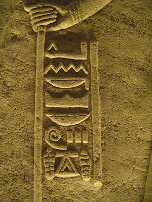 And there are three cartouche suspended at headgear-level, and two orbs above that, also bordered in this pattern. They look to represent physical objects present in the diagram, and not just bordered text. There are instances it is hard to tell if a glyph is showing a text box, a physical item, or both.