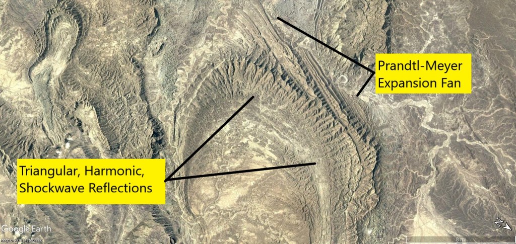 The next image shows greater fidelity of the intricate standing wave geometries that can form in the Lambda foot near the separation bubble. Bear in mind, the wind blows through sonic waves, but they aren’t bounded by the wind alone. They couple to, and vibrate the solid matter they contact, as some of the energy they convey reflects, and some absorbs depending on the properties of that material. These sonic wave patterns are what you’ll see if you examine rocks much. At least where I live, granite and quartz is crisscrossed with fissures in these same geometries.