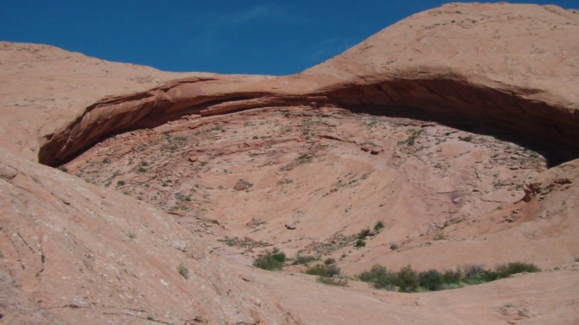 Look carefully at the next image, which is a close-up of the hole in the mountain in Comb Ridge. You will see the hole penetrates layers into the face of this tetrahedron, and even undercuts the rim. The hole penetrates deeper at the center, and concentric rings of the penetrated layers are exposed.