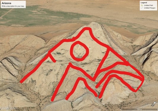 The next image highlights features of a mountain in Comb Ridge, Arizona, along the rim of Monument Valley, formed by an unstable shockwave. In it there is a circular hollow in the center of the tetrahedral mountain. This is also the result of an expansion zone that creates a tornadic circulation which eats into the separation bubble. Around it, harmonic mini-tetrahedrons are forming in forward positions as the destabilized shockwave was beginning to advance into the wind.