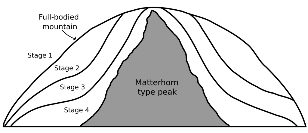 Never-mind wear causes shapes to round-off, not sharpen. It’s counter-intuitive that mountains result from wear, of course, because it’s nonsense. Welcome to cognitive dissonance.