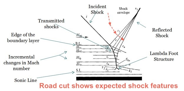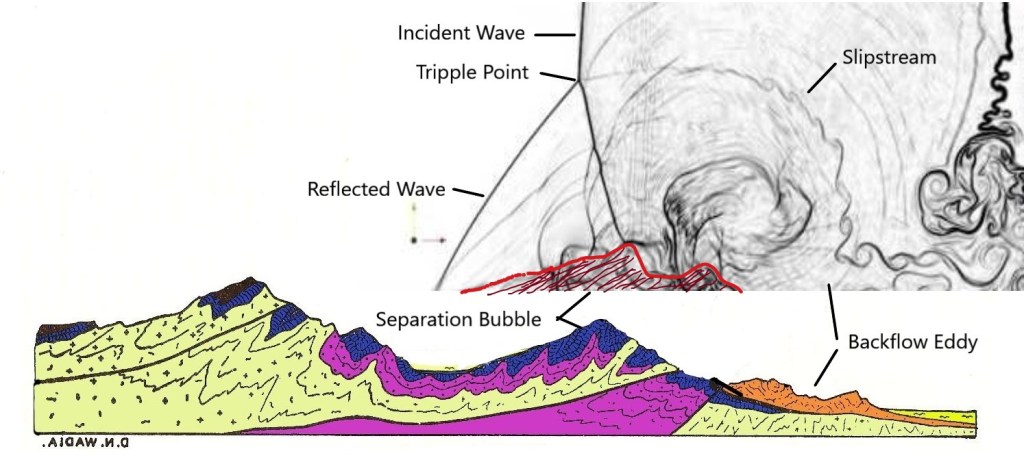 The highlighted features play the most common roles in mountain building. The first, most obvious feature to examine is the ‘Lambda Shock Structure’, also noted as the ‘Bifurcated Structure’, highlighted in red. This region is where a deflection of the supersonic wind creates a standing wave, called the ‘reflected shockwave’ in the diagram, because it is a reflection from the floor, but is sometimes referred to as the incident wave depending on the framework of the experiment.