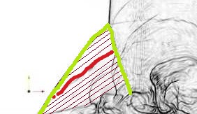 The outline, in green, profiles the hole discontinuity and blue lines trace the flowstone sucked into the gap. This tetrahedron formed in the separation bubble of a shockwave that destabilized, allowing a vortex to form on the face that penetrated the nascent tetrahedron and blew dust in, like injecting cream cheese. The shock wave itself, and the patterned layers that it molded, under tremendous pressure, were curled by the inflection in the wind, which changed the attitude and shape of the original tetrahedron, folding it back like a flap of croissant and filling beneath with hot fluid material.