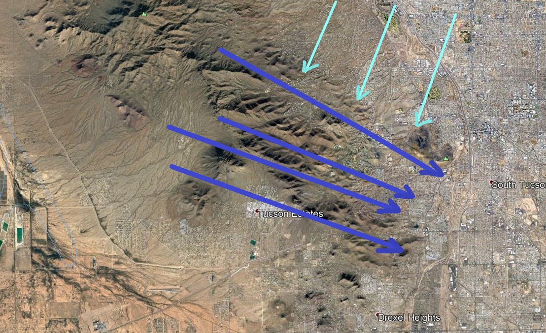 A separation bubble produces harmonics in wind tunnel tests that can be perfectly matched with complex mountain forms. Wind deposits “sediment” layers aligned with pressure regimes within the separation bubble. More often these are deposited in laminar planes, like this geologic depiction of the layers in the Catalina Mountains, in Tucson Arizona.