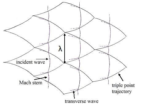Harmonics in shockwaves are found in longitudinal, transverse and compound form. A longitudinal harmonic occurs when multiple lambda structures form simultaneously, side-by-side across a wind-front as an interference pattern. A transverse harmonic occurs when sequential lambda structures form in-line with the wind, like a jagged sine wave, building tetrahedrons one atop, or in-front of another as the shock wave travels into the wind. A compound harmonic occurs when both happen together, in symphony.